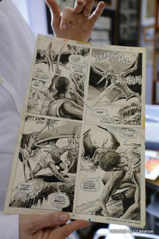 _MG_0422Colan encré par Joe Sinnott. Certaines planches sont signées, d’autres non. À l’époque, on ne les signait pas systématiquement. De nos jours, les jeunes dessinateurs composent leur planche en pensant à la revente de la planche originale. Mais pour la génération des Colan, il fallait vraiment croiser les dessinateurs pour les avoir signées. Une des trois est signée parce qu’il en avait fait cadeau à un de ses amis.