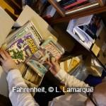 _MG_0383À l’époque où nous avons emménagé ici, cette pièce était une chambre et il y avait un dressing. J’ai tout débarrassé pour mettre des choses intéressantes à la place. Et j’y ai placé tout le domaine européen avec énormément de franco-belge. Parce que je maîtrise bien l’anglais, mais c’est la seule langue que je connaisse. Donc j’ai tout Hugo Pratt, par exemple, mais en traduction.