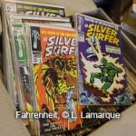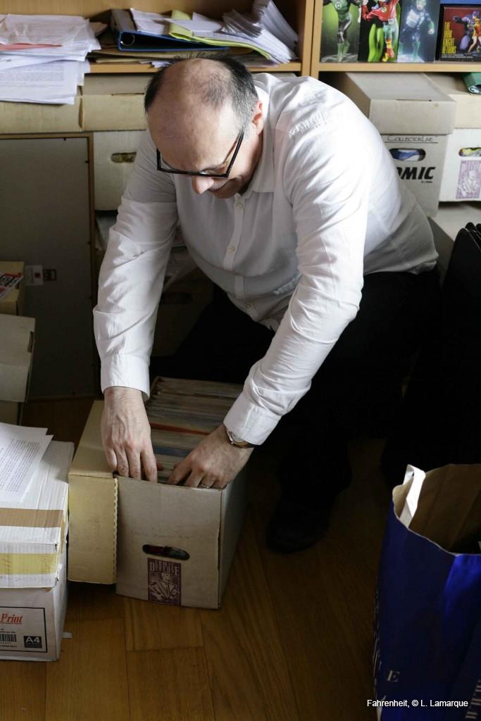La collection de comics est dans des cartons posés par terre. Il y en a à peu près 6000.