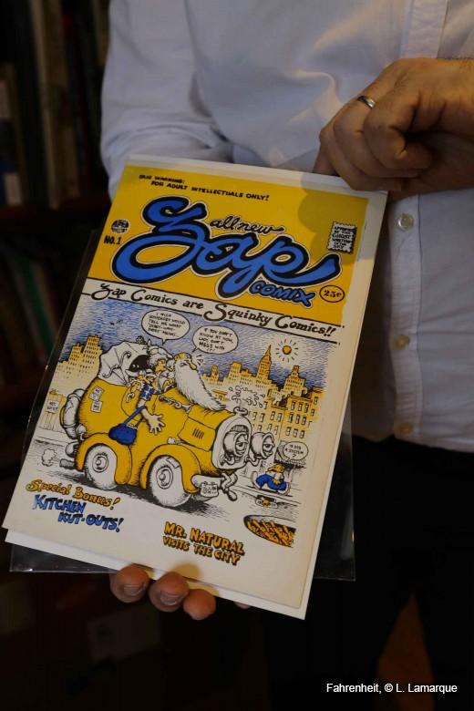 Et ça, c’est le tout premier Zap comics, la première bd de Robert Crumb, pratiquement auto-édité. La version à 25 cents qui aurait dû être tiré à 5000 exemplaires, mais qui ne l’a été qu’à 3500 tant il y a eu de ratés dans l’impression avec une presse qui n’était pas adaptée au format comic book.
