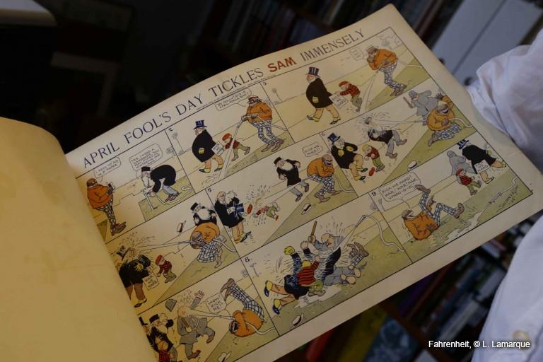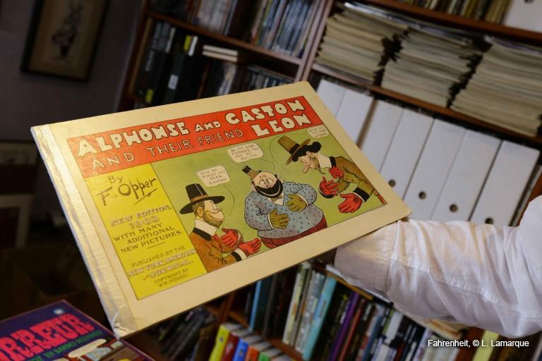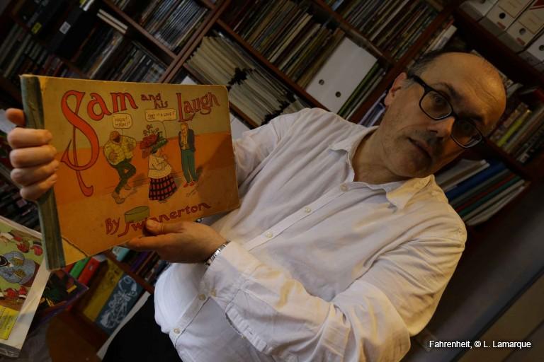Des albums de la première décennie du vingtième siècle. Ils sont vraiment rarissimes. J’en ai vu passer deux depuis que je collectionne des bd. C’est tellement particulier que personne ne les cherche vraiment. C’était vendu en librairie, c’était assez cher. Ça coutait 50 cents, ce qui représentait une semaine de salaire d’un ouvrier. Pour notre époque, c’est considéré comme raciste par les Américains. Toutes les vannes tournent autour d’un noir qui parle petit nègre, qui fait des farces, qui se fait asperger par le jet d’eau. Et c’est d’une rareté phénoménale. Et pourtant, ça vaut moins cher qu’un Silver Surfer. C’est pour les historiens qui s’intéressent à la bande dessinée du début du vingtième siècle. Et les éditeurs d’aujourd’hui ne veulent pas le rééditer parce que c’est raciste. Pourtant, dans un beau fac-similé à mille exemplaires, ça trouverait son public.