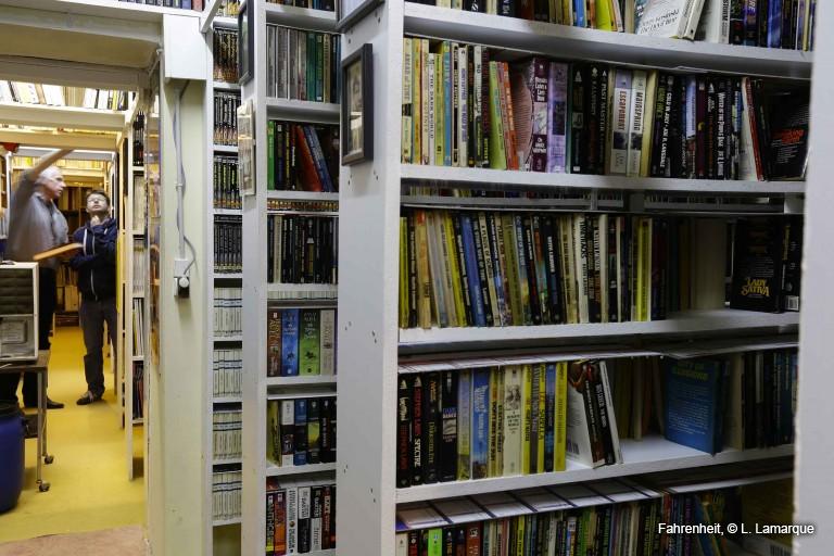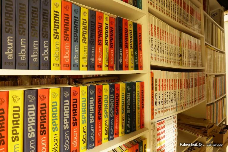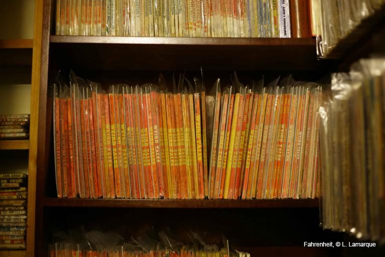 Une fois passés plusieurs rayonnages de petits formats 13×21, on arrive aux bandes dessinées plus grandes, comme les Artima des années cinquante ou les magazines Sagédition. On va indifféremment du western aux séries pour enfants en passant par les super-héros, avant de traverser plusieurs travées d’albums cartonnés. Ensuite on se retrouve dans une autre salle consacrée à la SF. Il y a d’abord les revues françaises (collec complète de Fiction ou de Galaxie, etc) et bon nombre de revues anglaises et américaines. On découvre après les romans de SF avec les collections complètes du Fleuve Noir Anticipation, de Présence du Futur, de J’ai Lu ou de Pocket, entre autres, avant les grands formats. Un peu plus loin il y a une impressionnante allée de romans SF-fantastique en anglais et enfin des pulps américains, magnifiques magazines aussi beaux que chargés d’histoires. Une troisième salle, comme une excroissance, abrite tous les journaux et les revues de bandes dessinées qui, pour des raisons de format, devaient être classés à part : collections exhaustives de Spirou, Pilote, Tintin (version Belge et Française), de Vaillant et sa suite Pif Gadget, mais aussi Fillette, Lisette ou Record… Pour sa part la bande dessinée britannique n’est pas oubliée : Valiant, Eagle ou TV Express et Mickey Mouse Weekly voisinent avec 2000 AD. Après plusieurs milliers d’albums Bonelli et autant de mangas, viennent ensuite les comics américains, dont quelques trésors à faire baver d’envie certains collectionneurs américains : outre les collections complètes de Spider–man, X-Men ou Fantastic Four dans des états superbes, Francis possède aussi des comics plus anciens que le Silver Age ; il y a foule de Kirby, Ditko et d’autres génies graphiques américains.